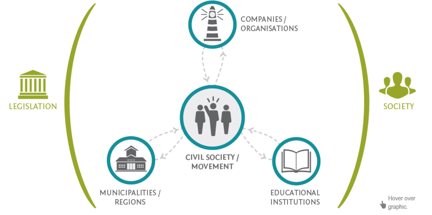Politically it is an engine for legal change. The objective of engagement is a good life for all living beings and for the planet, underpinned by an economic system that serves the common good. Human dignity, solidarity, ecological sustainability, social justice and democratic participation are all essential values.