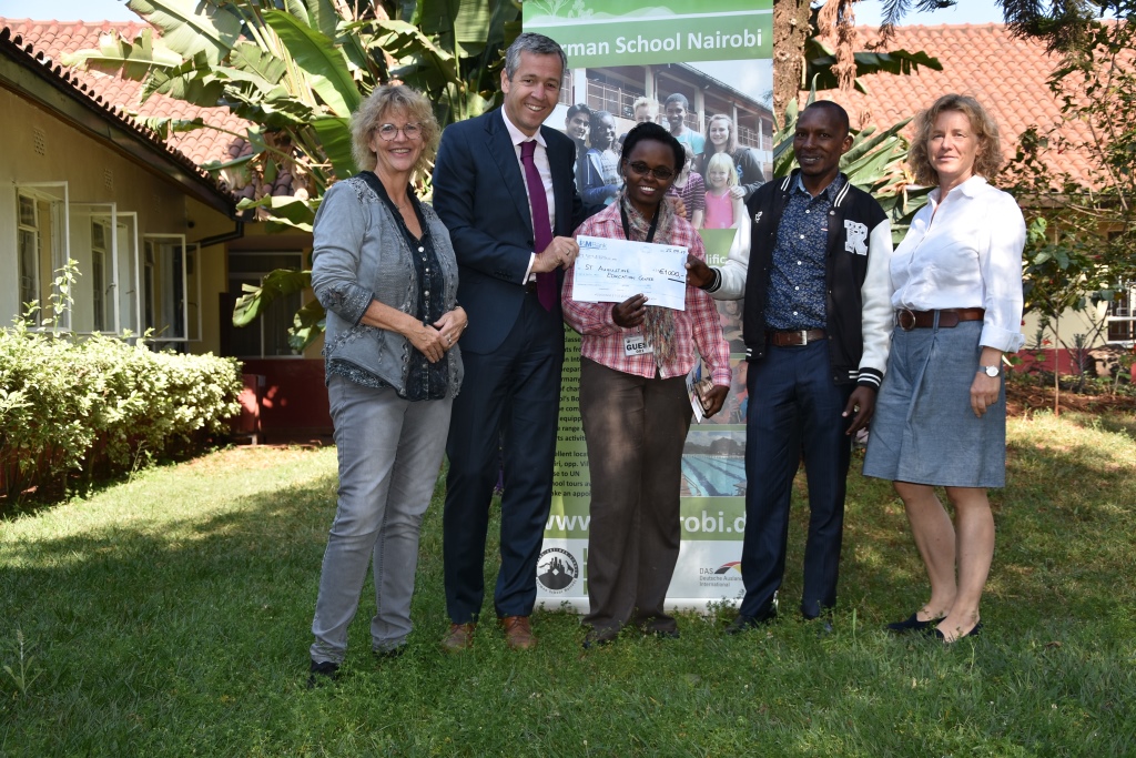 Representatives of the German School Nairobi, namely Sybille Seite (Headmaster), Anja Schupp (Head of Adminstrations) and Michael Loose (Head of Finance) have been honored to provide the big symbolic donation cheque to Judy Nyambura and Simon Chege, both directors of St. Augustine Education Center.